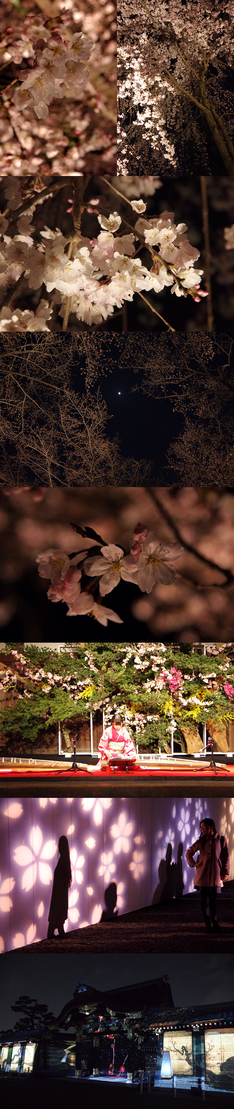 Ce week-end marque le début officiel de la floraison des cerisiers ! Le château Nijô 二条城 est l’un des endroits de Kyoto à visiter absolument, d’une part parce que le parc entourant le château est rempli de cerisiers de plusieurs essences différentes, donnant un camaïeu de rose absolument ravissant, mais aussi pour ses animations (concerts de Koto, stands de dégustations, boutiques souvenirs…) et surtout son spectacle de projection mapping (sur la façade sud du mur d’enceinte). Aussi quand la nuit tombe, les cerisiers se font plus mystérieux et la magie de leurs fleurs, pétales en flocons, opère d’autant plus !