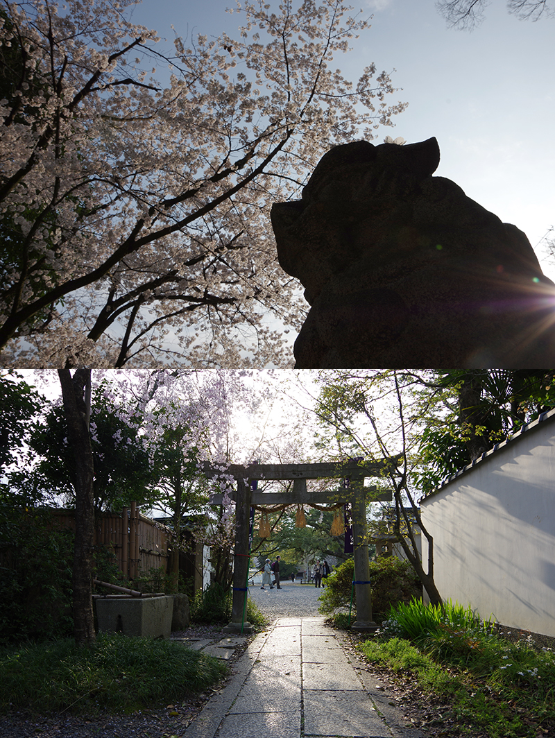 Contre-jour sur koma-inu 狛犬, chien-lion gardien des dieux et sur le tori 鳥居, porte d’entrée marquant le passage du profane au sacré.