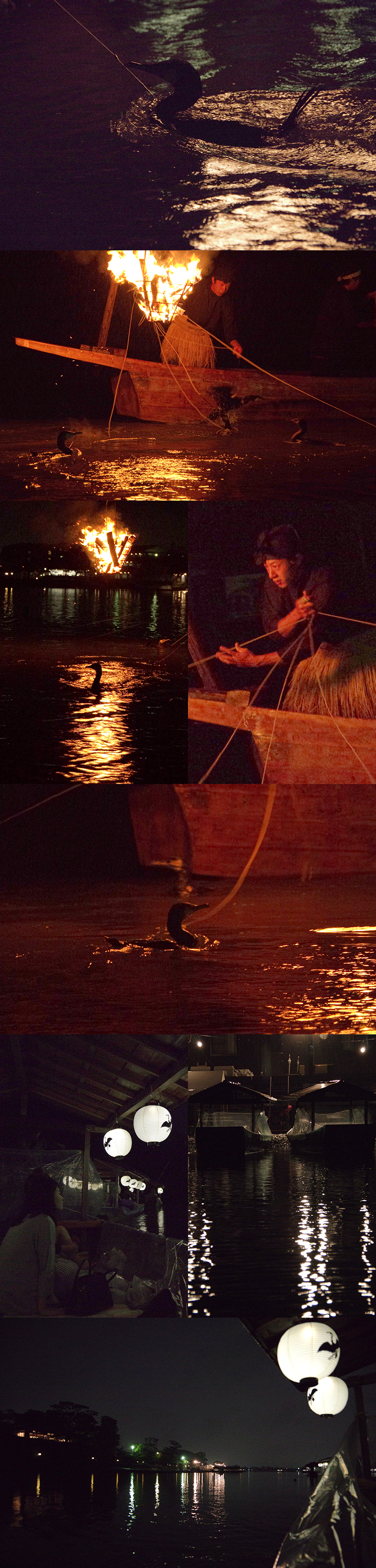 Les cormorans sont tenus en laisse par leur maitre : Ushô (鵜匠). La laisse, utile pour rapatrier l’oiseau lorsque celui-ci a fait une prise, est également là pour justement lui serrer suffisamment le cou afin qu’il n’avale pas le poisson qu’il vient de prendre et puisse donc le recracher sans encombre.