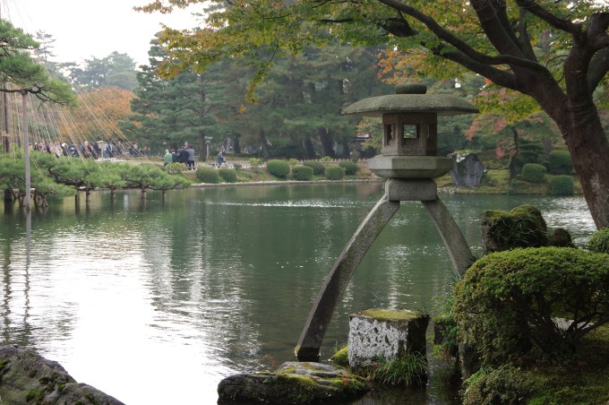 Note : sur les pins du parc Kenroku-en, on peut voir un jeu de cordes qui partent du sommet d’un pilier de bambou et sont nouées aux branches. Cette technique s’appelle Yukitsuri (雪吊り) et comme son nom l’indique, les cordes ainsi disposées sont là pour protéger l’arbre lorsqu’il neige fortement, les cordes soutenant les branches en faisant contrepoids au fur et à mesure que la neige s’accumule.
