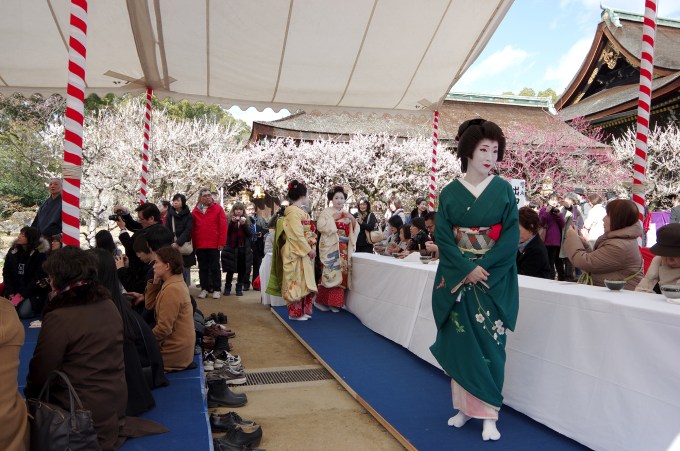 Today, February 25th, is a very important date for Kitano Tenmangu Shrine, celebrating the plum blossoms (Baika Sai) with a giant tea ceremony organized by the maiko and geiko from the nearby Kamishichiken district.