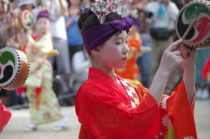 Les photos ci-dessous ont été prises au sanctuaire Shinto Shiramine Jinja (白峯神社) à Kyoto. La journée était en deux parties avec une démonstration de Kemari (蹴鞠), un jeu de balle traditionnel où le but est de se faire le plus de passes possible en frappant une balle molle avec la jambe bien tendue. La seconde partie était une ronde exécutée par un groupe de jeunes filles, âgées de 4 à 15 ans environ, toutes vêtues de manière traditionnelle et festive et munies d’un petit tambourin. Le clou de la danse étant les deux jeunes filles vêtues comme Horihime et HikoBoshi exécutant leur partie avec beaucoup de grâce.