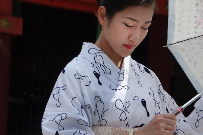 En cette saison estivale, toutes portent un Yukata (kimono en coton très fin, non doublé) aux couleurs traditionnelles, le contraste entre le bleu et le blanc et la taille des motifs créant une impression de fraîcheur. Les motifs sont eux aussi en raccord avec la saison : cette année ce sont des gourdes / calebasses que l’on appelle par ici des Hyoutan 瓢箪.