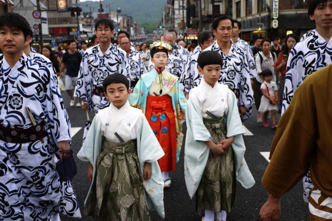 Ce soir, nouvelle déambulation dans les rues de Kyoto pour le Yoi yama 宵山, soit la veille de la grande parade. Toujours autant de monde, de couleurs, de motifs et, hasard sublime, cette fois j’ai pu m’approcher à quelques mètres du Chigo 稚児, l’enfant sacré qui sera à la tête du cortège lors du défilé, dans le char le plus prestigieux : le Naginata-hoko 長刀鉾. (photo ci-dessus).