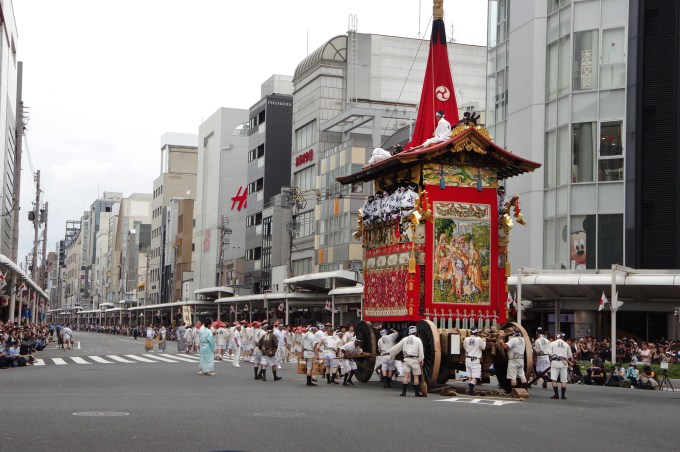 Le 17 juillet marque l’apogée du Gion Matsuri, avec le défilé des chars qui étaient stationnés depuis déjà une semaine un peu partout dans le centre ville. Aujourd’hui c’est donc le grand jour pour la vingtaine de chars, les équipes à pied et les musiciens à bord. C’est le Naginata-hoko 長刀鉾, qui a la particularité de transporter le Chigo 稚児, ou enfant sacré, qui ouvre la marche. Chaque char est présenté comme il se doit avec un porte drapeau mais également un messager qui vient de manière assez dramatique présenter le parchemin portant le nom du char et de l’équipage.
